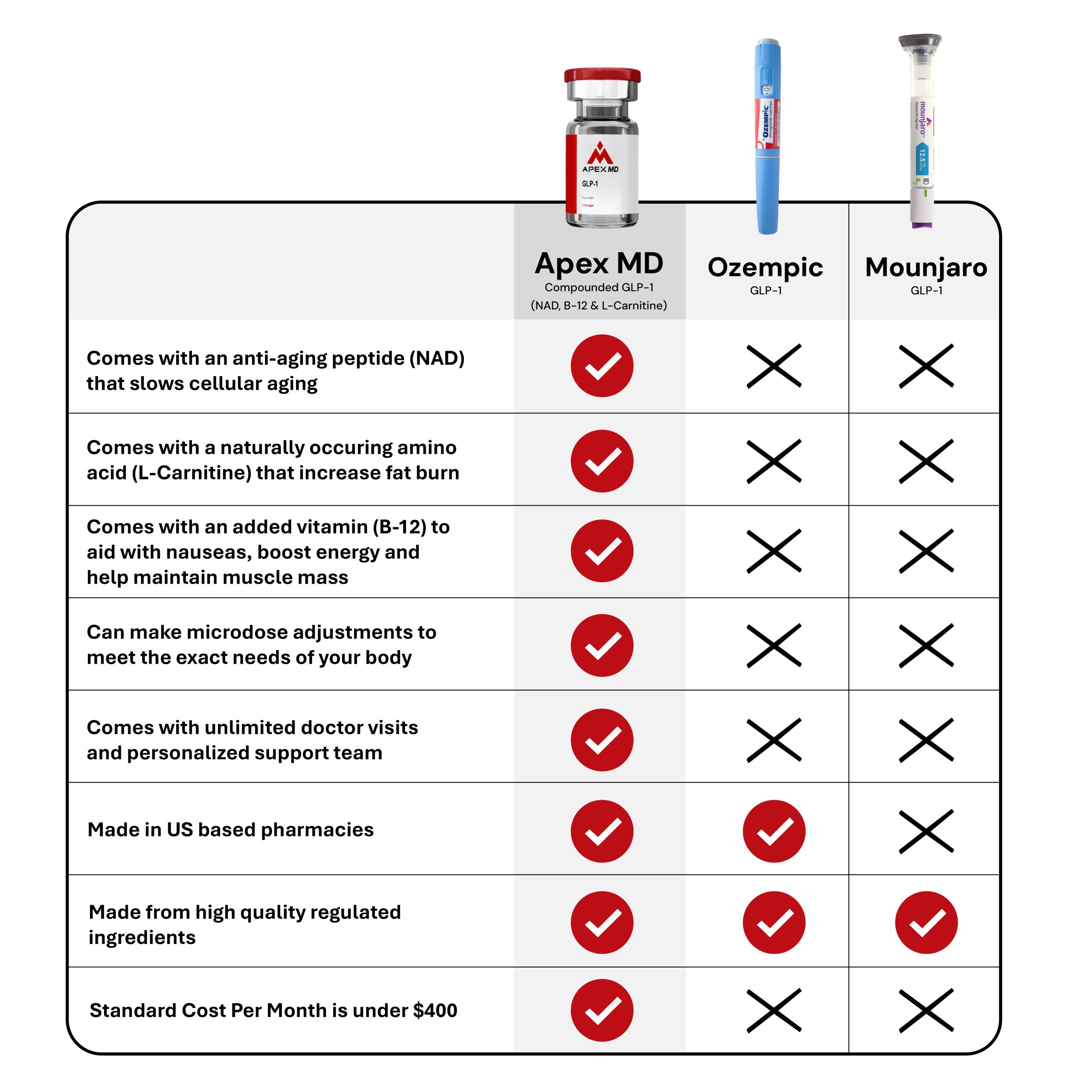 The mainstream brands of Ozempic and Mounjaro and other compounding pharmacies only have the substance of Semaglutide or Tirzepatide in their vials. Apex MD vials are mixed with additive amino acids, mitochondrial energy boosters and vitamins to meet the unique needs of your body. Our medical providers consult with you in depth to understand your goals to titrate your medication specially for your body. Also, mainstream GLP-1 companies and compounding pharmacies use a cookie cutter template titration formula that does not fit optimally for many people. This potentially gives people too much or too little medication hindering results and causing undesired side effects.